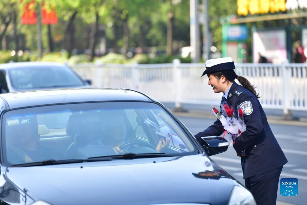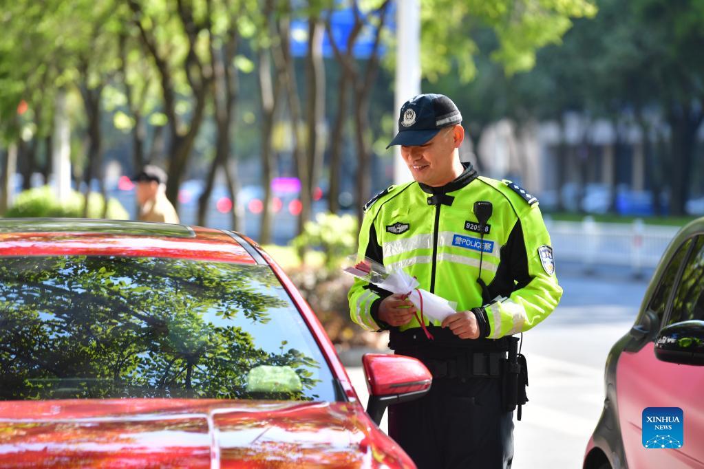 A traffic police officer sends flowers to a driver who stops politely to allow pedestrians to cross in Liuzhou, south China's Guangxi Zhuang Autonomous Region, Dec. 2, 2021. Dec. 2 marks the national traffic safety day in China. An event was held in Liuzhou to promote traffic safety. (Xinhua/Huang Xiaobang)
