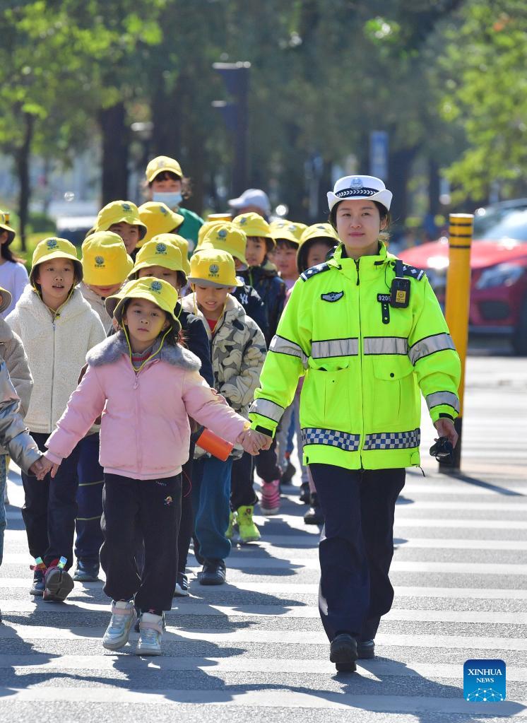 A traffic police officer escorts pupils across a street in Liuzhou, south China's Guangxi Zhuang Autonomous Region, Dec. 2, 2021. Dec. 2 marks the national traffic safety day in China. An event was held in Liuzhou to promote traffic safety. (Xinhua/Huang Xiaobang)