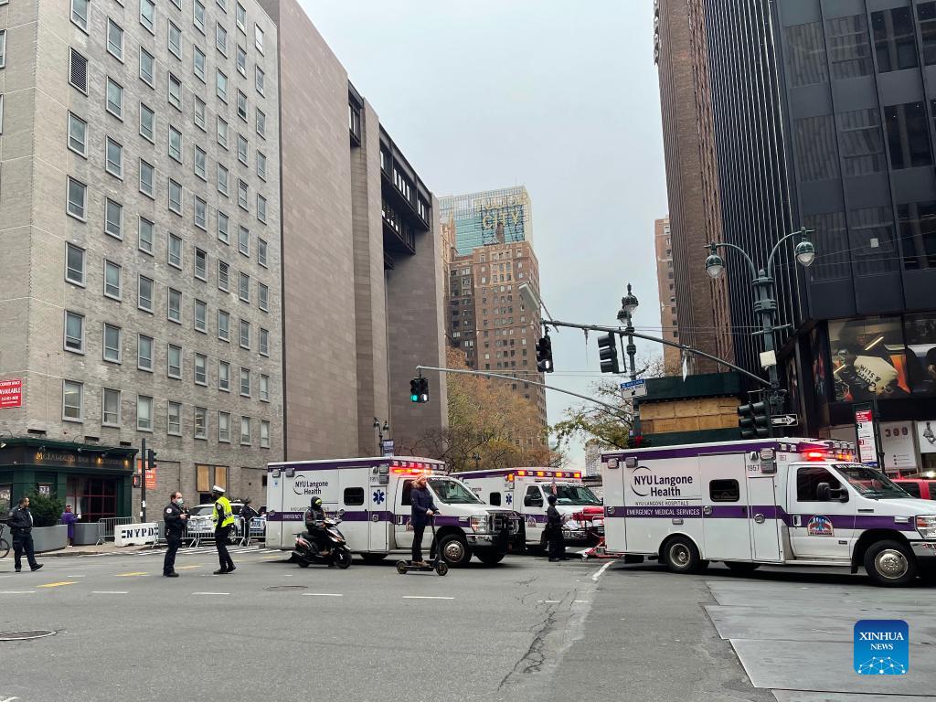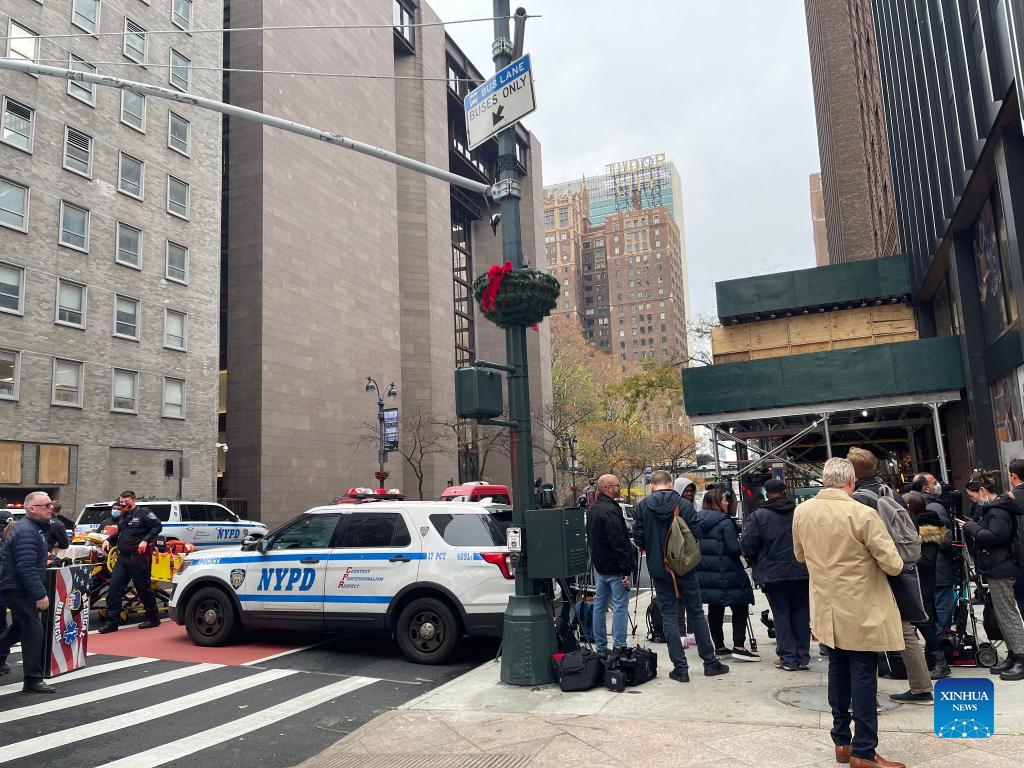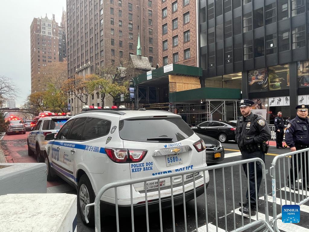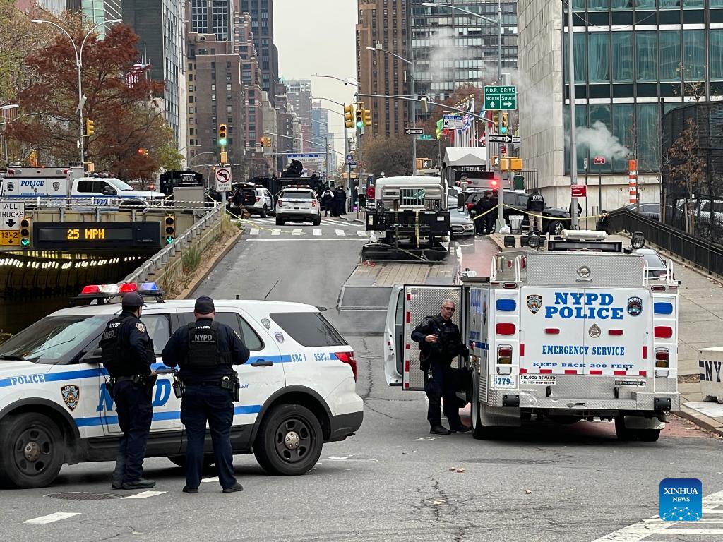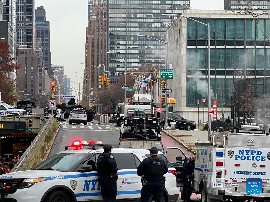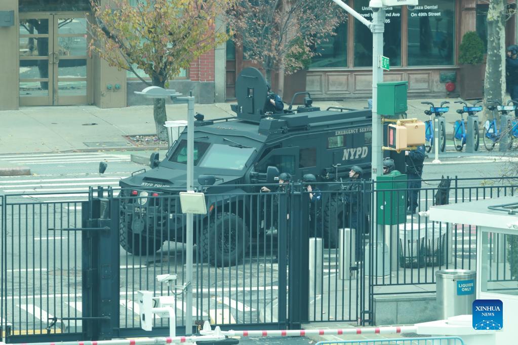 First responders are seen near the UN headquarters building in New York, the United States, on Dec. 2, 2021. The UN headquarters building in New York was on lockdown Thursday after a man with a shotgun was spotted outside. (Xinhua/Wang Jiangang)