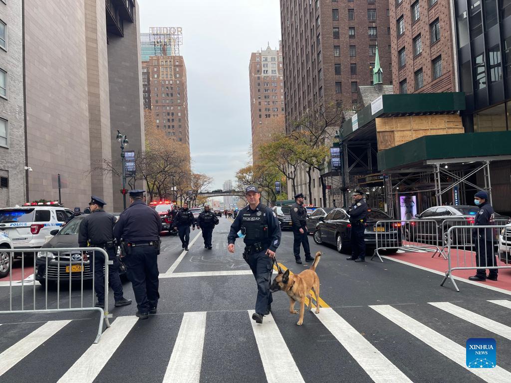 Police officers are seen near the UN headquarters building in New York, the United States, on Dec. 2, 2021. The UN headquarters building in New York was on lockdown Thursday after a man with a shotgun was spotted outside. (Xinhua/Wang Jiangang)