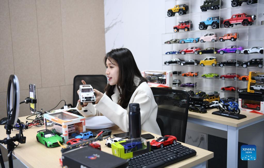 A social media influencer promotes toys via livestreaming in Chenghai District of Shantou City, south China's Guangdong Province, Dec. 2, 2021. Chenghai District in the city of Shantou is dubbed "the capital of toys in China" as the toy industry continues to flourish in this coastal region and a complete industrial chain has been formed. To overcome the impact of the COVID-19 outbreak on the toy industry, the local authorities have been actively supporting the upgrading of the toy industry and helping enterprises build sales platforms as well as open up new sales channels. In the first three quarters of 2021, the toy production value of Chenghai hit 9.296 billion yuan (about 1.4 billion U.S. dollars) and from January to July this year, the district has exported toys worth 2.738 billion yuan, accounting for 56.64 percent of the district's total exports. (Xinhua/Deng Hua)