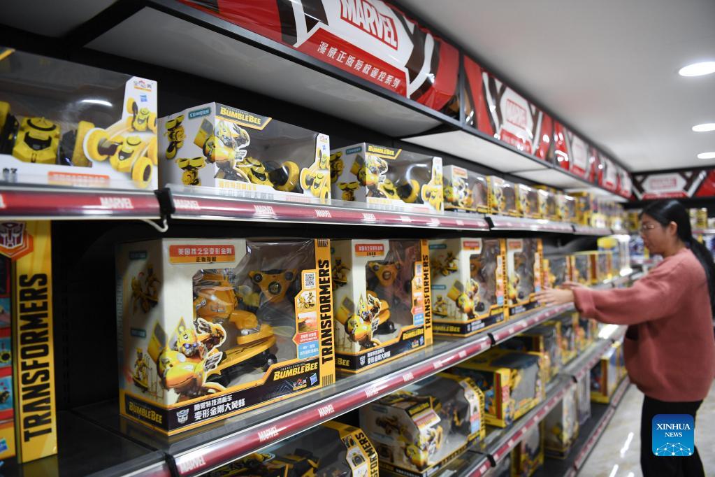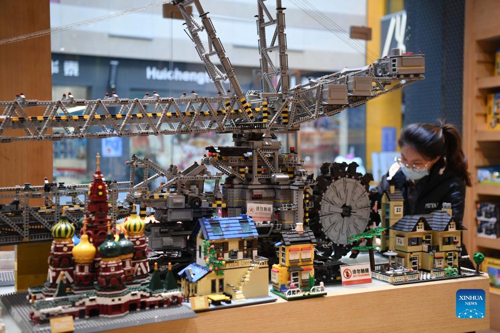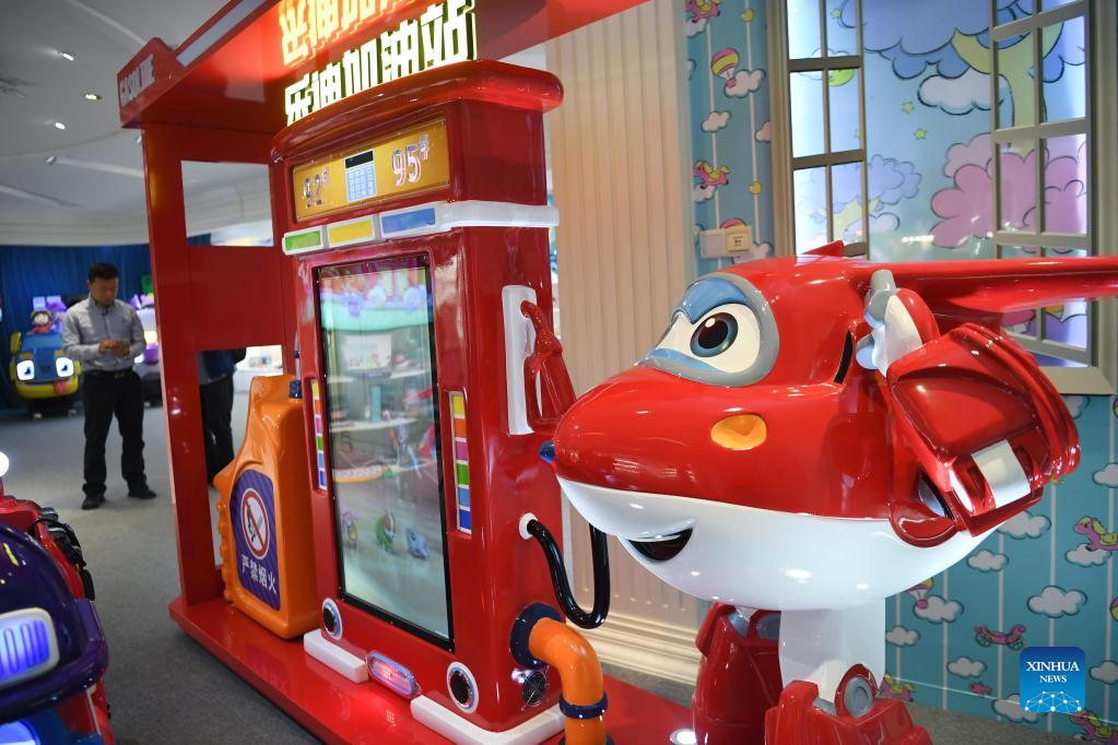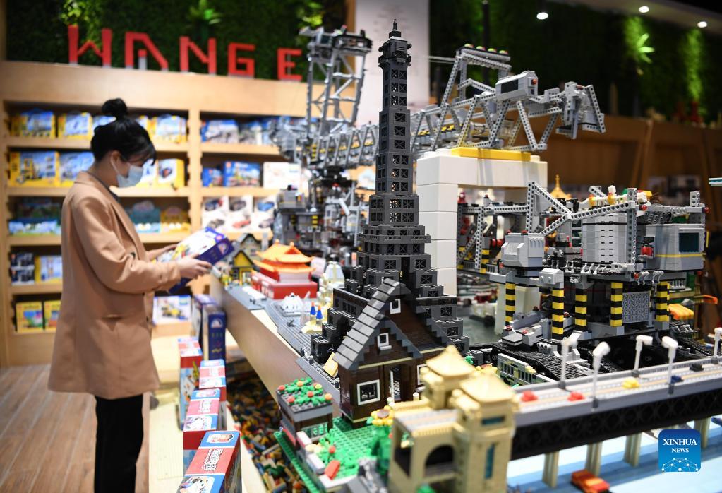 Toys are displayed at a cultural and tourism industrial park in Chenghai District of Shantou City, south China's Guangdong Province, Dec. 1, 2021. Chenghai District in the city of Shantou is dubbed "the capital of toys in China" as the toy industry continues to flourish in this coastal region and a complete industrial chain has been formed. To overcome the impact of the COVID-19 outbreak on the toy industry, the local authorities have been actively supporting the upgrading of the toy industry and helping enterprises build sales platforms as well as open up new sales channels. In the first three quarters of 2021, the toy production value of Chenghai hit 9.296 billion yuan (about 1.4 billion U.S. dollars) and from January to July this year, the district has exported toys worth 2.738 billion yuan, accounting for 56.64 percent of the district's total exports. (Xinhua/Deng Hua)