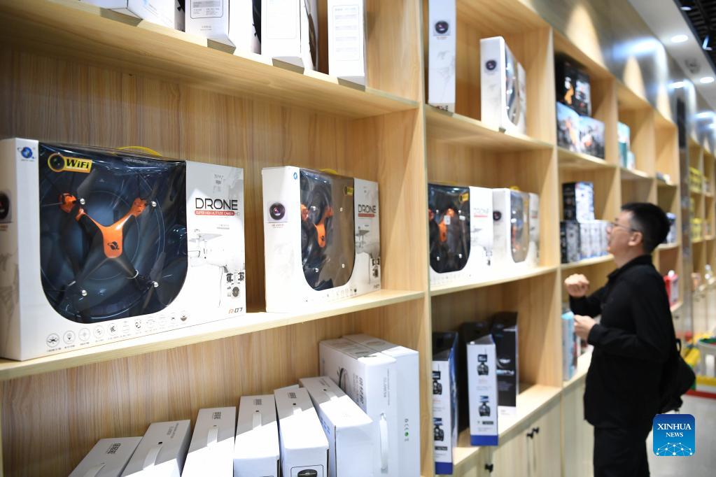 A visitor buys toy drones at a cultural and tourism industrial park in Chenghai District of Shantou City, south China's Guangdong Province, Dec. 1, 2021. Chenghai District in the city of Shantou is dubbed "the capital of toys in China" as the toy industry continues to flourish in this coastal region and a complete industrial chain has been formed. To overcome the impact of the COVID-19 outbreak on the toy industry, the local authorities have been actively supporting the upgrading of the toy industry and helping enterprises build sales platforms as well as open up new sales channels. In the first three quarters of 2021, the toy production value of Chenghai hit 9.296 billion yuan (about 1.4 billion U.S. dollars) and from January to July this year, the district has exported toys worth 2.738 billion yuan, accounting for 56.64 percent of the district's total exports. (Xinhua/Deng Hua)