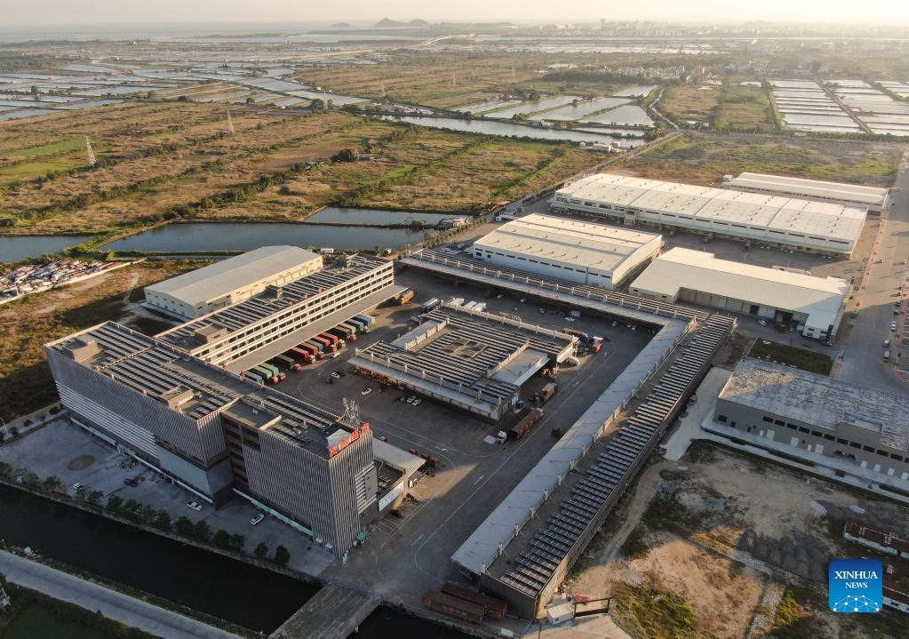 Aerial photo taken on Dec. 1, 2021 shows the logistics zone of a toy cultural and tourism industrial park in Chenghai District of Shantou City, south China's Guangdong Province. Chenghai District in the city of Shantou is dubbed "the capital of toys in China" as the toy industry continues to flourish in this coastal region and a complete industrial chain has been formed. To overcome the impact of the COVID-19 outbreak on the toy industry, the local authorities have been actively supporting the upgrading of the toy industry and helping enterprises build sales platforms as well as open up new sales channels. In the first three quarters of 2021, the toy production value of Chenghai hit 9.296 billion yuan (about 1.4 billion U.S. dollars) and from January to July this year, the district has exported toys worth 2.738 billion yuan, accounting for 56.64 percent of the district's total exports. (Xinhua/Deng Hua)