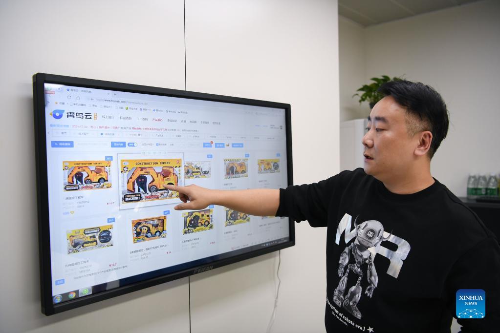 A staff member shows an online toy exhibition hall in Chenghai District of Shantou City, south China's Guangdong Province, Dec. 2, 2021. Chenghai District in the city of Shantou is dubbed "the capital of toys in China" as the toy industry continues to flourish in this coastal region and a complete industrial chain has been formed. To overcome the impact of the COVID-19 outbreak on the toy industry, the local authorities have been actively supporting the upgrading of the toy industry and helping enterprises build sales platforms as well as open up new sales channels. In the first three quarters of 2021, the toy production value of Chenghai hit 9.296 billion yuan (about 1.4 billion U.S. dollars) and from January to July this year, the district has exported toys worth 2.738 billion yuan, accounting for 56.64 percent of the district's total exports. (Xinhua/Deng Hua)