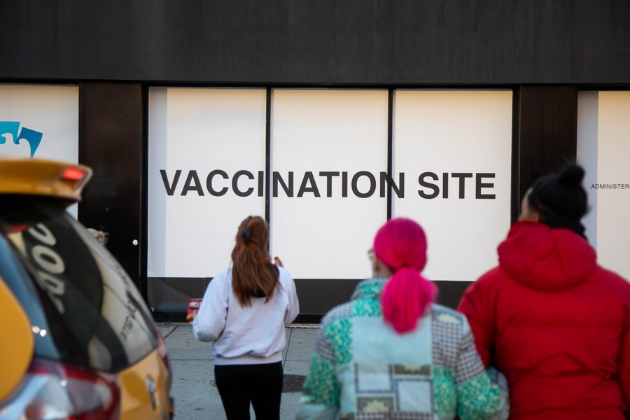Pedestrians walk in front of a COVID-19 vaccination site in the Brooklyn borough of New York, the United States, Nov. 19, 2021. (Photo by Michael Nagle/Xinhua)