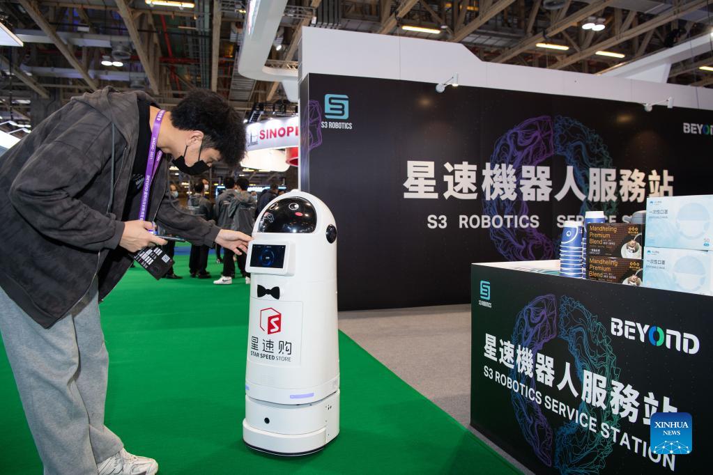 A staff member adjusts a robot on display at the first BEYOND International Technology Innovation Expo in south China's Macao, Dec. 2, 2021. (Xinhua/Cheong Kam Ka)