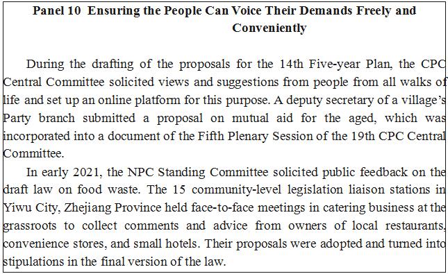 The people's demands can be freely expressed and effectively fulfilled. Democracy starts with the full expression of the people's wishes, but if people can only voice their wishes but have no way to fulfill them, that is no real democracy. China has ensured that its people have channels to express their aspirations, wishes and demands on issues ranging from important national strategies and policies to social governance and basic necessities of life, enabling their voices to be heard and their requests to be answered.