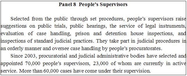 Judicial supervision. The judicial and procuratorial organs, in accordance with their statutory purview and procedures, supervise the exercise of public power mandated by the people. Judicial supervision is the most forceful form of oversight of the CPC and the state; it is the ultimate "line of defense" to ensure lawful exercise of public power.