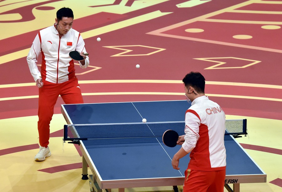 Xu Xin (L) and Ma Long perform tricks playing with three balls at the same time at the Queen Elizabeth Stadium, Hong Kong, China, Dec. 4, 2021. (Xinhua/Lu Binghui)
