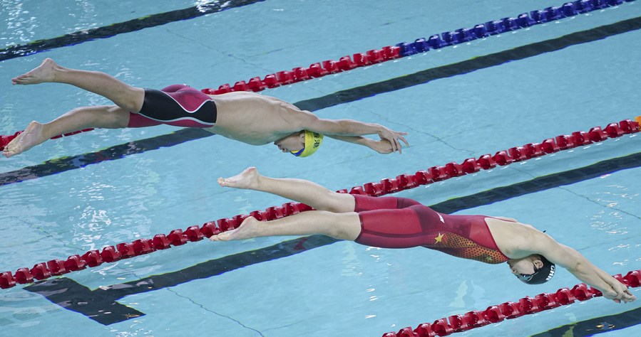 Yang Junxuan (R) has a demonstration swim at the Victoria Park Swimming Pool in Hong Kong, China, Dec. 4, 2021. (Xinhua/Lyu Xiaowei)