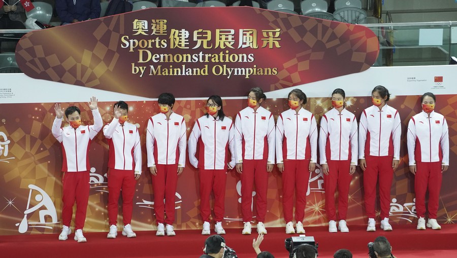Chinese mainland Olympians greet the audience at the Victoria Park Swimming Pool in Hong Kong, China, Dec. 4, 2021. (Xinhua/Lyu Xiaowei)