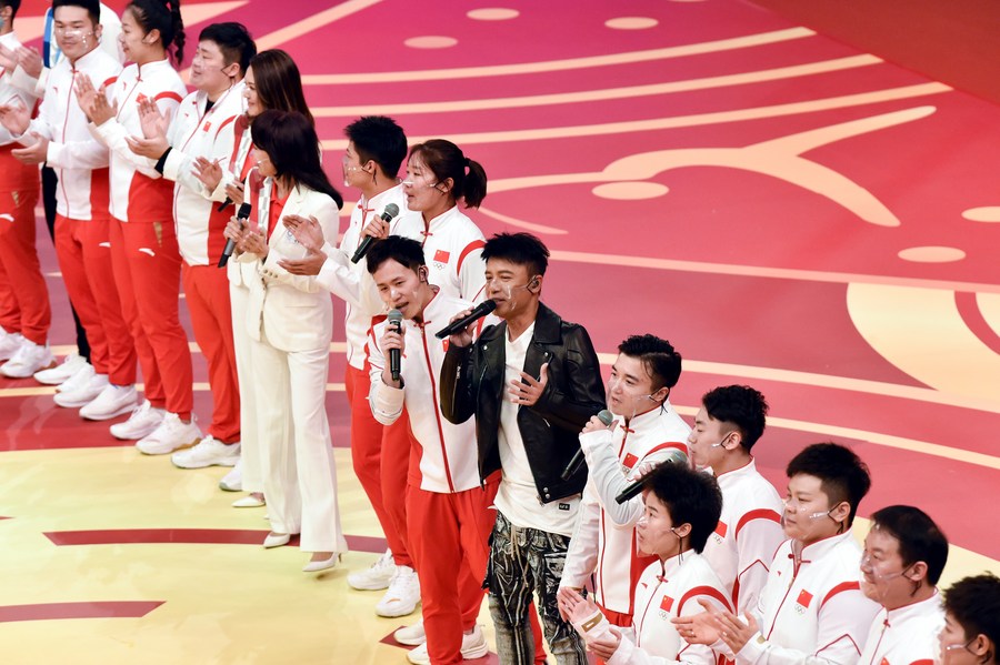 Chinese mainland Olympians sing with Hacken Lee during a variety show at the Queen Elizabeth Stadium in Hong Kong, China, Dec. 4, 2021. (Xinhua/Lu Binghui)