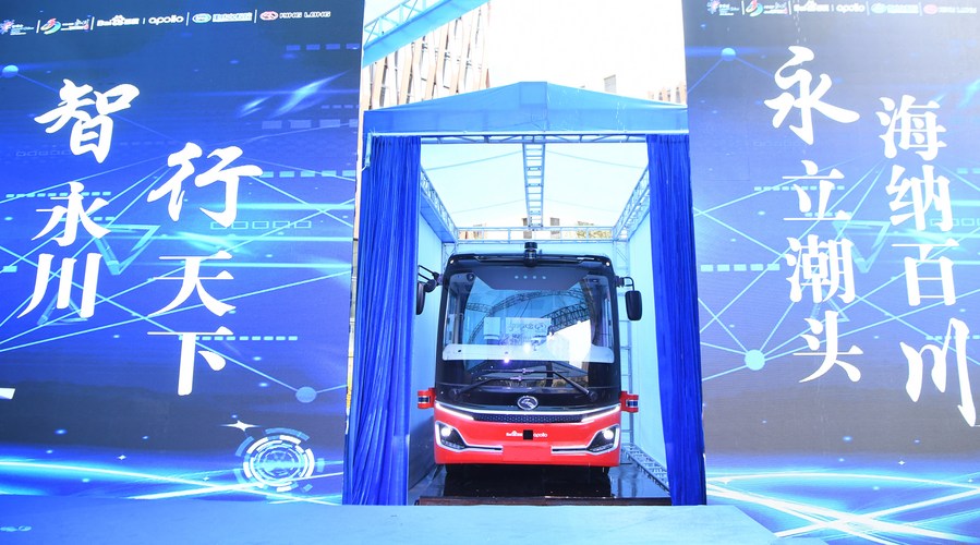 An L4 autonomous bus makes its debut during the launching ceremony in southwest China's Chongqing Municipality, Sept. 17, 2020. (Xinhua/Wang Quanchao)