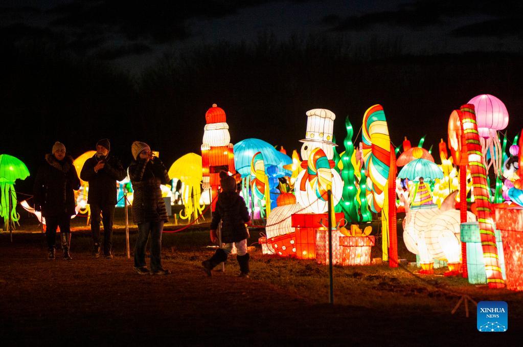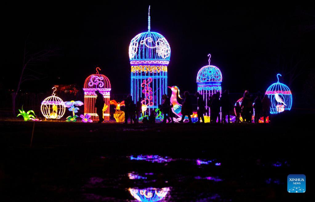 Visitors view light installations during the Seasky International Light Show in Niagara Falls, Ontario, Canada, on Dec. 4, 2021. Featuring over 30 magical LED light installations on a 1.2-kilometer illuminated trail, the lantern and light show will be open from Nov. 18, 2021 to Feb. 27, 2022. (Photo by Zou Zheng/Xinhua)
