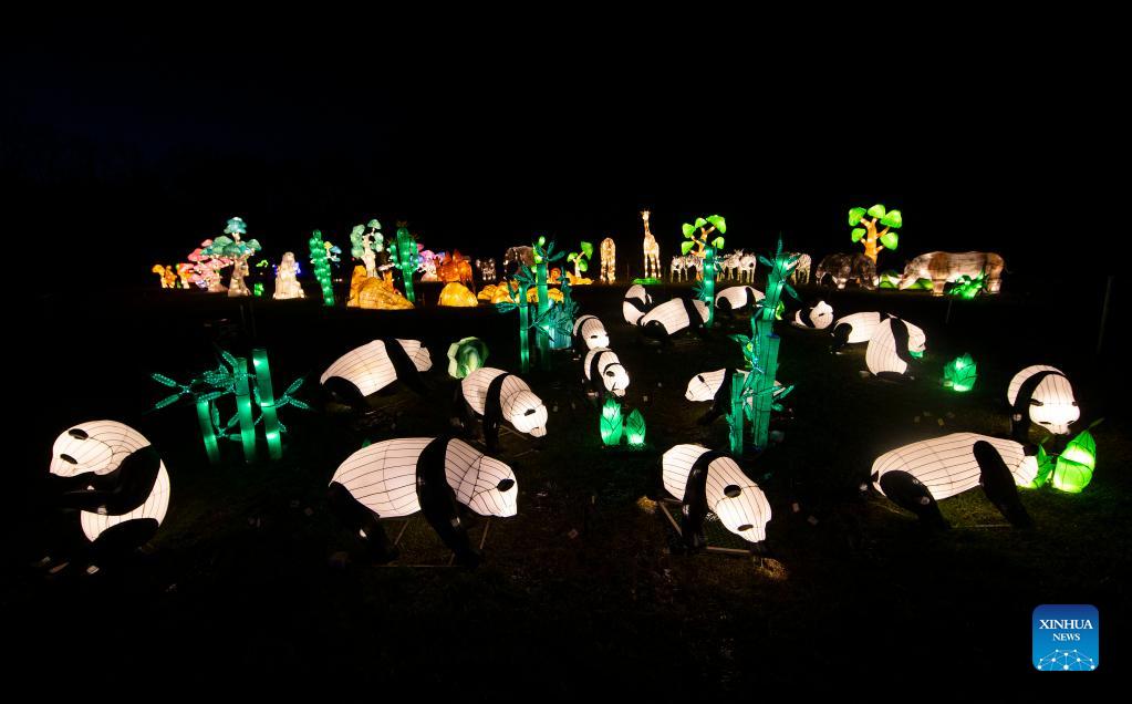 The light installation "Panda Park" is seen during the Seasky International Light Show in Niagara Falls, Ontario, Canada, on Dec. 4, 2021. Featuring over 30 magical LED light installations on a 1.2-kilometer illuminated trail, the lantern and light show will be open from Nov. 18, 2021 to Feb. 27, 2022. (Photo by Zou Zheng/Xinhua)