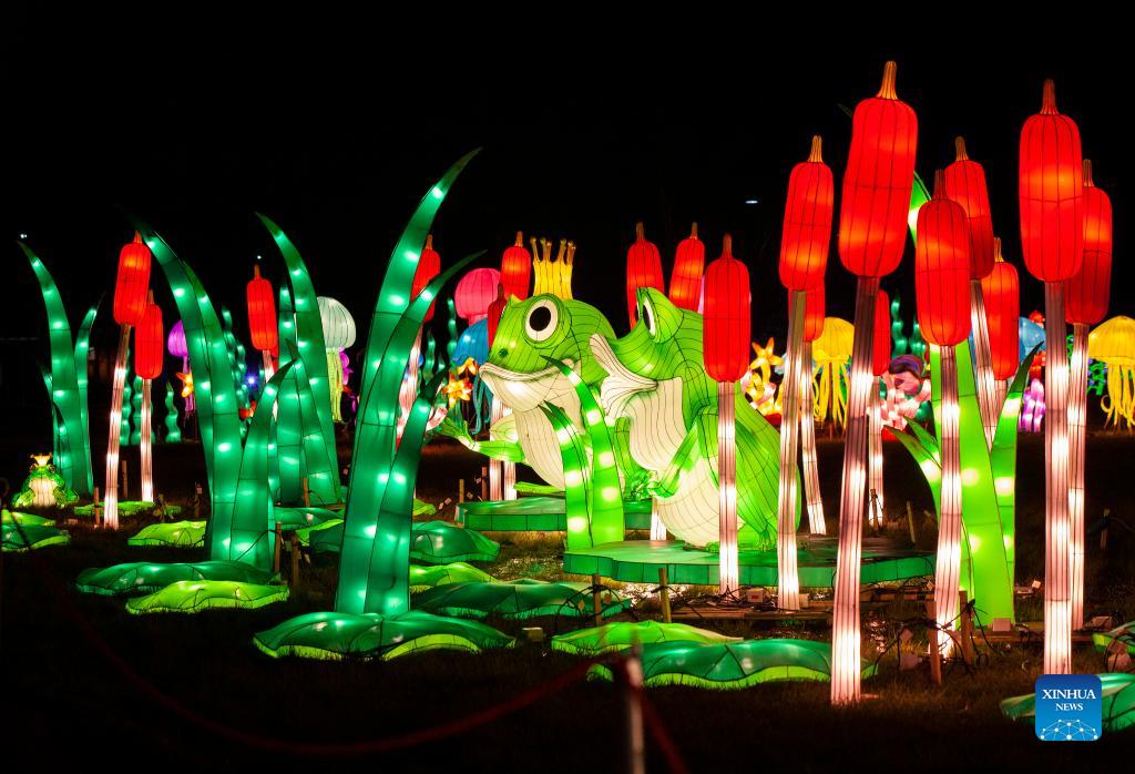 The light installation "Frog Prince" is seen during the Seasky International Light Show in Niagara Falls, Ontario, Canada, on Dec. 4, 2021. Featuring over 30 magical LED light installations on a 1.2-kilometer illuminated trail, the lantern and light show will be open from Nov. 18, 2021 to Feb. 27, 2022. (Photo by Zou Zheng/Xinhua)