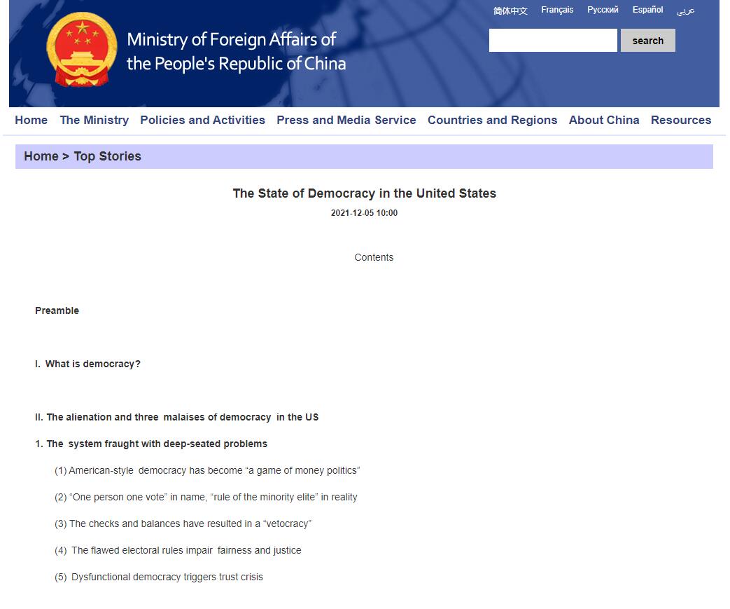 BEIJING, Dec. 5 (Xinhua) -- China's Ministry of Foreign Affairs on Sunday released a report on its website titled "The State of Democracy in the United States."