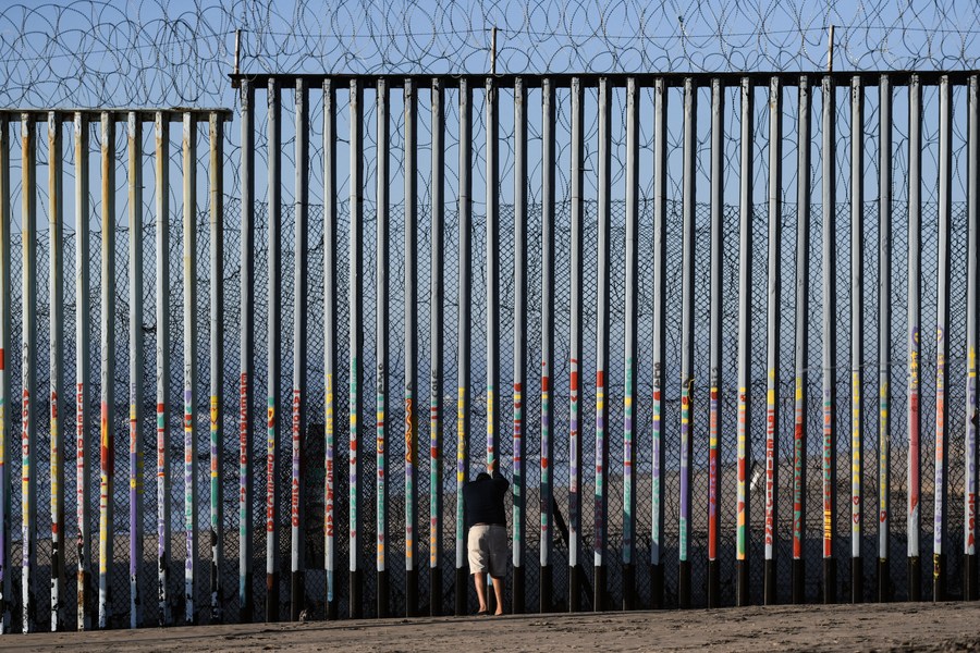 Photo taken on Jan. 10, 2019 shows a man in front of the U.S.-Mexico border barrier in Tijuana, Mexico. (Xinhua/Xin Yuewei)