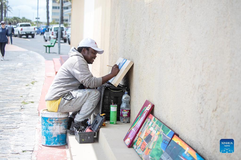 A person paints on the seaside in Cape Town, South Africa, Dec. 5, 2021. South Africa has entered the fourth wave of the pandemic with the new variant at the center of the rise in cases, Health Minister Joe Phaahla said at a briefing on Friday. (Xinhua/Lyu Tianran)