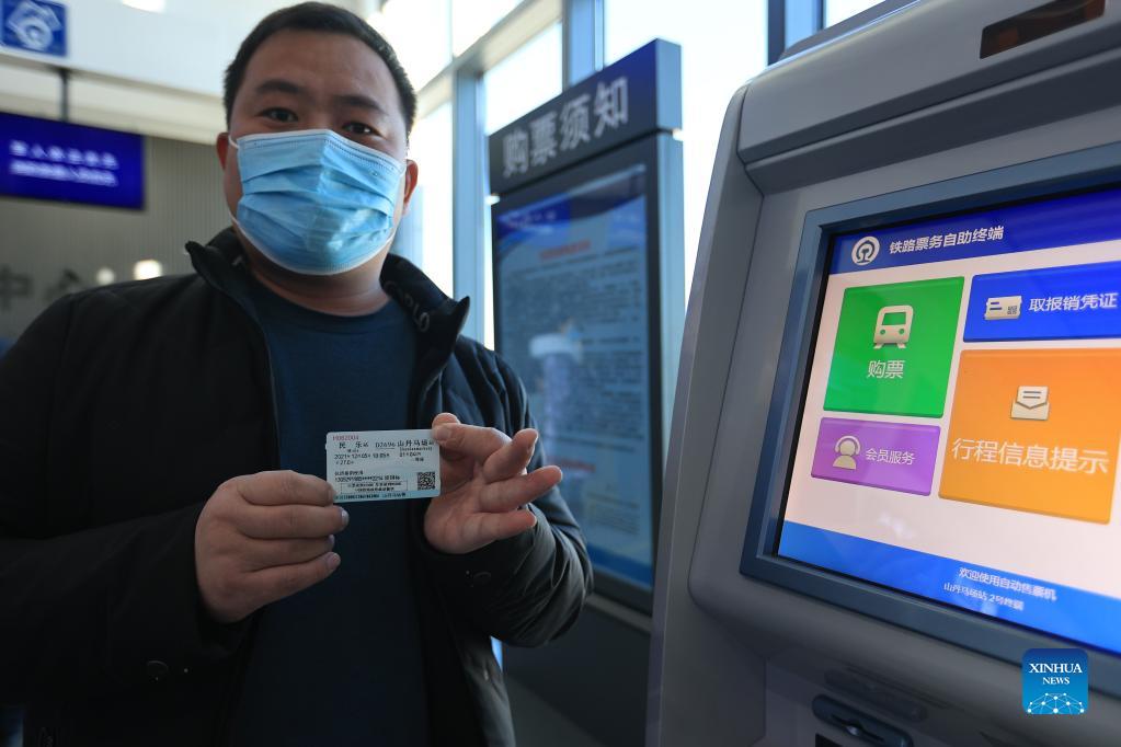 A passenger shows his ticket at the Shandan Horse Ranch Railway Station of the Lanzhou-Xinjiang Railway in Shandan County, Zhangye City, northwest China's Gansu Province, Dec. 5, 2021. The Shandan Horse Ranch Railway Station, at an altitude of over 3,000 meters, started operation on Sunday. Bullet trains, which can take passengers to Lanzhou, Xi'an, Urumqi, Jiayuguan and Dunhuang, will pull into the station every day. The Lanzhou-Xinjiang Railway links northwest China's Gansu Province and Xinjiang Uygur Autonomous Region. Situated in the Qilian Mountains, the Shandan Horse Ranch is one of the world's oldest ranches. Its mission as a royal breeding center for warhorses began as early as the Han Dynasty (202 BC-220 AD), and the ranch maintained this mission through centuries. After the founding of the People's Republic of China in 1949, the ranch, under the control of the People's Liberation Army (PLA), provided horses for military use over a span of five decades. In recent years, with the continuous and conspicuous improvement of the ecological environment in the Qilian Mountains, the Shandan Horse Ranch has been boosting eco-tourism. The operation of the Shandan Horse Ranch Railway Station will help the area's "lucid waters and lush mountains" become even more valuable assets, as more tourists will be able to visit its unique landscape of prairie, horse ranch and snow mountain. (Photo by Wang Chao/Xinhua)