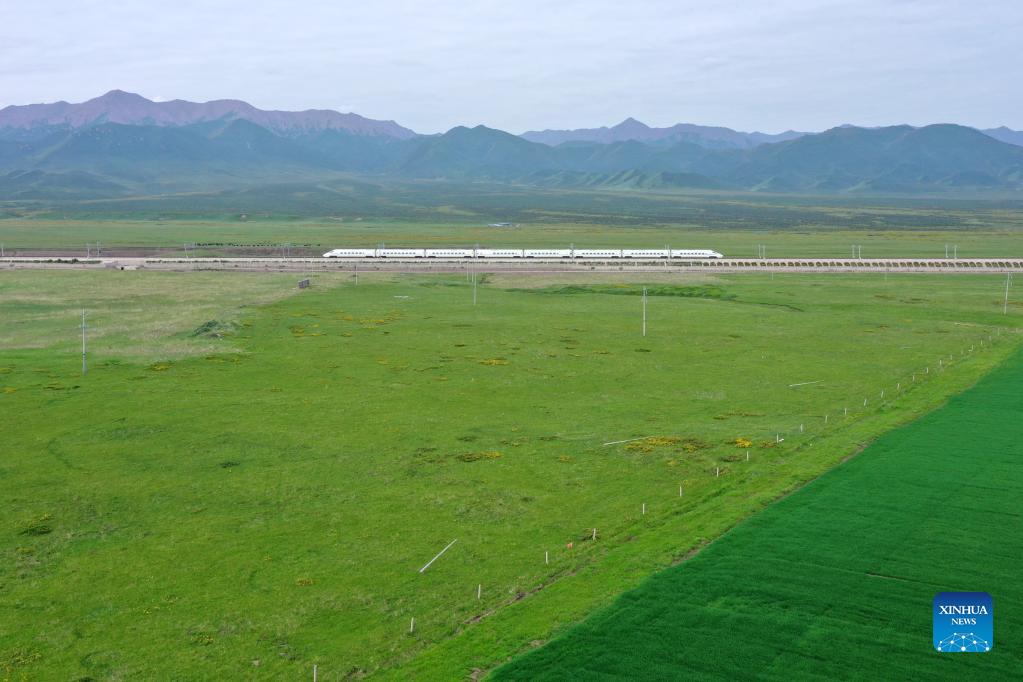Aerial photo taken on July 15, 2021 shows a bullet train traversing the Shandan Horse Ranch in Shandan County, Zhangye City, northwest China's Gansu Province. The Shandan Horse Ranch Railway Station, at an altitude of over 3,000 meters, started operation on Sunday. Bullet trains, which can take passengers to Lanzhou, Xi'an, Urumqi, Jiayuguan and Dunhuang, will pull into the station every day. The Lanzhou-Xinjiang Railway links northwest China's Gansu Province and Xinjiang Uygur Autonomous Region. Situated in the Qilian Mountains, the Shandan Horse Ranch is one of the world's oldest ranches. Its mission as a royal breeding center for warhorses began as early as the Han Dynasty (202 BC-220 AD), and the ranch maintained this mission through centuries. After the founding of the People's Republic of China in 1949, the ranch, under the control of the People's Liberation Army (PLA), provided horses for military use over a span of five decades. In recent years, with the continuous and conspicuous improvement of the ecological environment in the Qilian Mountains, the Shandan Horse Ranch has been boosting eco-tourism. The operation of the Shandan Horse Ranch Railway Station will help the area's "lucid waters and lush mountains" become even more valuable assets, as more tourists will be able to visit its unique landscape of prairie, horse ranch and snow mountain. (Xinhua/Fan Peishen)