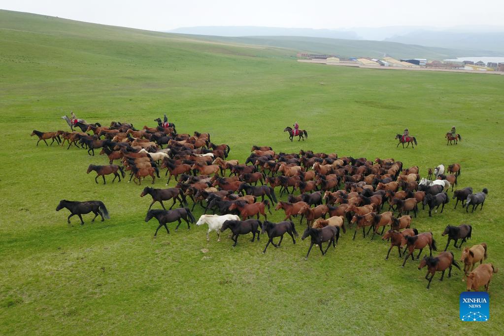 Aerial photo taken on June 19, 2021 shows horses galloping at the Shandan Horse Ranch in Shandan County, Zhangye City, northwest China's Gansu Province. The Shandan Horse Ranch Railway Station, at an altitude of over 3,000 meters, started operation on Sunday. Bullet trains, which can take passengers to Lanzhou, Xi'an, Urumqi, Jiayuguan and Dunhuang, will pull into the station every day. The Lanzhou-Xinjiang Railway links northwest China's Gansu Province and Xinjiang Uygur Autonomous Region. Situated in the Qilian Mountains, the Shandan Horse Ranch is one of the world's oldest ranches. Its mission as a royal breeding center for warhorses began as early as the Han Dynasty (202 BC-220 AD), and the ranch maintained this mission through centuries. After the founding of the People's Republic of China in 1949, the ranch, under the control of the People's Liberation Army (PLA), provided horses for military use over a span of five decades. In recent years, with the continuous and conspicuous improvement of the ecological environment in the Qilian Mountains, the Shandan Horse Ranch has been boosting eco-tourism. The operation of the Shandan Horse Ranch Railway Station will help the area's "lucid waters and lush mountains" become even more valuable assets, as more tourists will be able to visit its unique landscape of prairie, horse ranch and snow mountain. (Xinhua/Fan Peishen)
