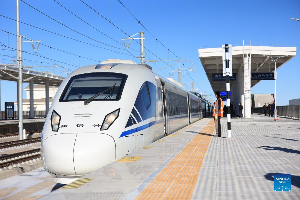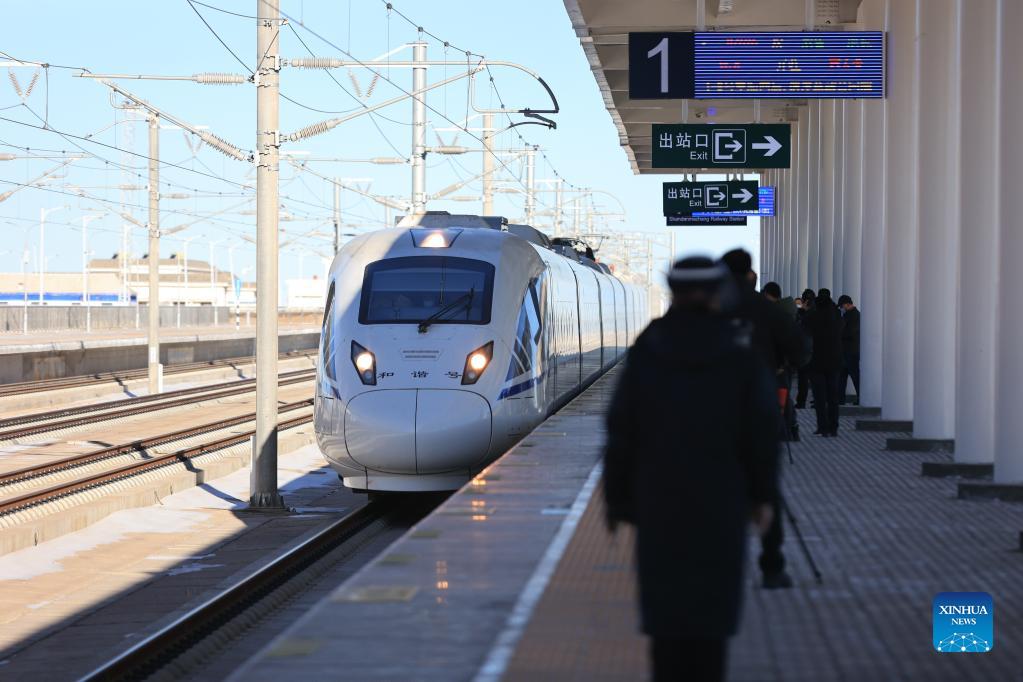 A bullet train pulls in at the Shandan Horse Ranch Railway Station of the Lanzhou-Xinjiang Railway in Shandan County, Zhangye City, northwest China's Gansu Province, Dec. 5, 2021. The Shandan Horse Ranch Railway Station, at an altitude of over 3,000 meters, started operation on Sunday. Bullet trains, which can take passengers to Lanzhou, Xi'an, Urumqi, Jiayuguan and Dunhuang, will pull into the station every day. The Lanzhou-Xinjiang Railway links northwest China's Gansu Province and Xinjiang Uygur Autonomous Region. Situated in the Qilian Mountains, the Shandan Horse Ranch is one of the world's oldest ranches. Its mission as a royal breeding center for warhorses began as early as the Han Dynasty (202 BC-220 AD), and the ranch maintained this mission through centuries. After the founding of the People's Republic of China in 1949, the ranch, under the control of the People's Liberation Army (PLA), provided horses for military use over a span of five decades. In recent years, with the continuous and conspicuous improvement of the ecological environment in the Qilian Mountains, the Shandan Horse Ranch has been boosting eco-tourism. The operation of the Shandan Horse Ranch Railway Station will help the area's "lucid waters and lush mountains" become even more valuable assets, as more tourists will be able to visit its unique landscape of prairie, horse ranch and snow mountain. (Photo by Wang Chao/Xinhua)