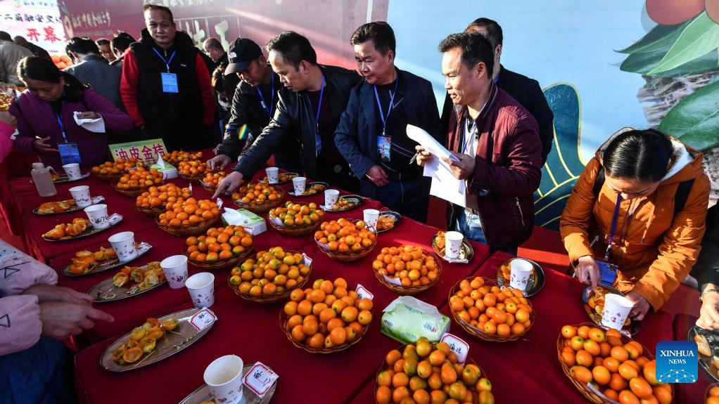 Judges evaluate candidates at a "Kumquats King" contest in Rongan County, south China's Guangxi Zhuang Autonomous Region, Dec. 3, 2021. Over the last few years, local authorities have promoted the kumquat planting business, which has become a pillar industry in increasing the income of local farmers. A total of 207,200 mu (about 13,813 hectares) of kumquat trees planted in 12 townships of the county this year are expected to yield 195,000 tons of kumquats. (Xinhua/Huang Xiaobang)