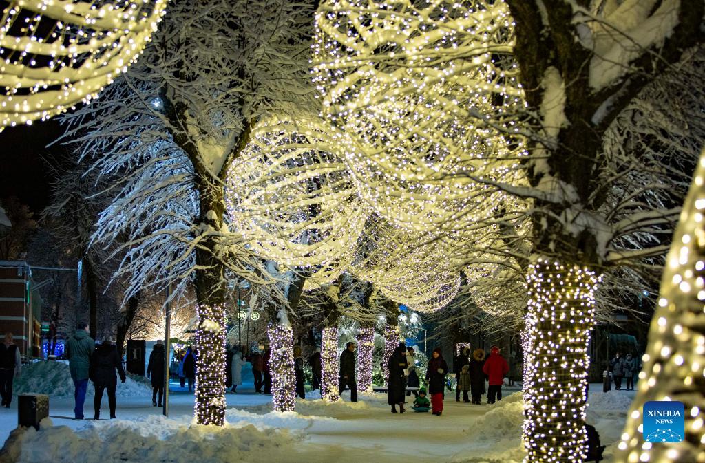 People enjoy Christmas lights in Ogre, Latvia, on Dec. 5, 2021. (Photo by Edijs Palens/Xinhua)