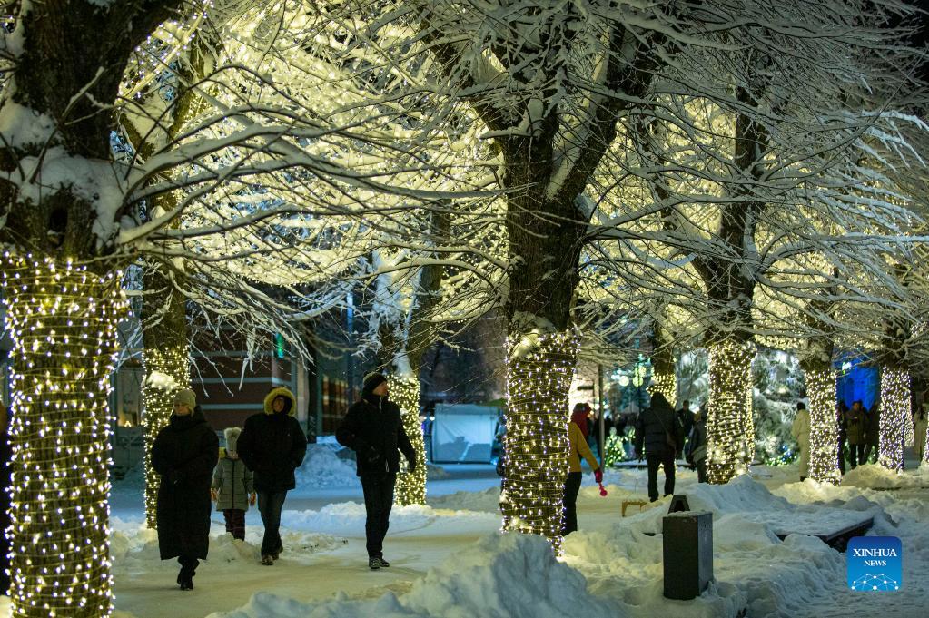 People enjoy Christmas lights in Ogre, Latvia, on Dec. 5, 2021. (Photo by Edijs Palens/Xinhua)
