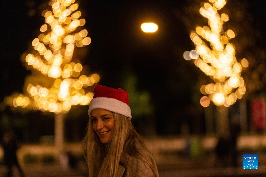 A woman is seen in front of festive lights in Athens, Greece, on Dec. 5, 2021. (Xinhua/Marios Lolos)