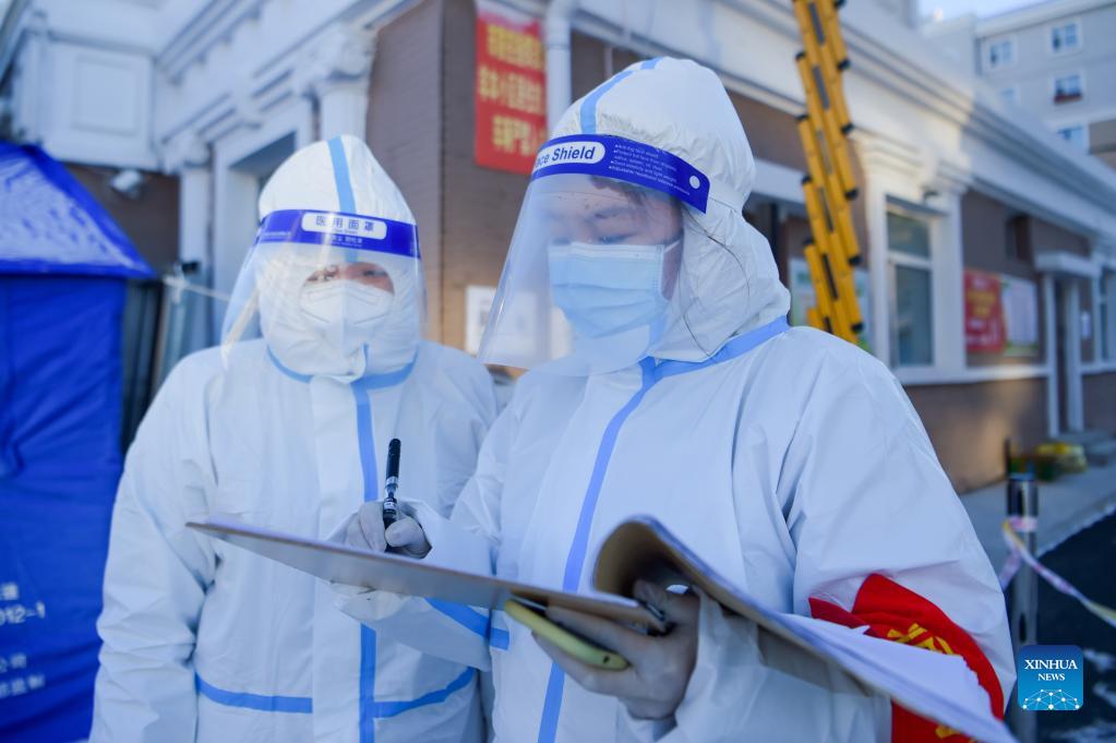 Staff members work at a residential area in the border city of Manzhouli in north China's Inner Mongolia Autonomous Region, Dec. 4, 2021. The border city of Manzhouli in north China's Inner Mongolia Autonomous Region reported 17 locally-transmitted confirmed COVID-19 cases from 12 a.m. to 2 p.m. Saturday, local authorities said. In the latest outbreak, the city has reported 314 locally-transmitted confirmed COVID-19 cases of which nine are serious. Expert medical teams have prepared treatment programs for these nine patients. (Xinhua/Li Zhipeng)