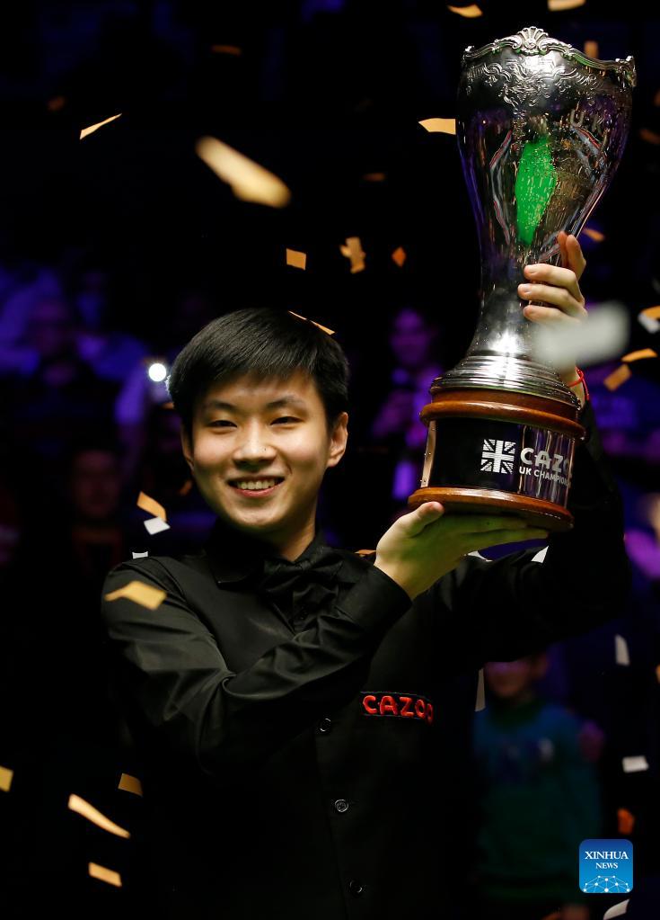 Zhao Xintong of China celebrates with the trophy after winning the final match against Luca Brecel of Belgium at 2021 UK Snooker Championship in York, Britain on Dec. 5, 2021. Zhao beat Brecel 10-5 and claimed the title. (Photo by Craig Brough/Xinhua)