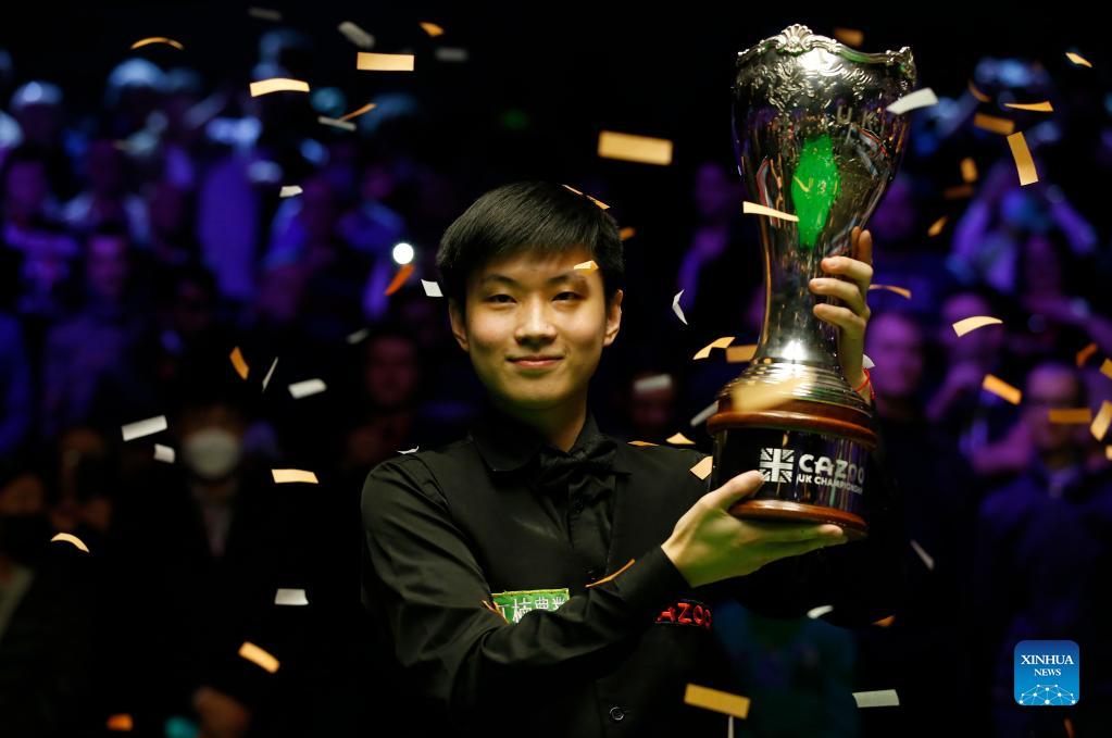 Zhao Xintong of China celebrates with the trophy after winning the final match against Luca Brecel of Belgium at 2021 UK Snooker Championship in York, Britain on Dec. 5, 2021. Zhao beat Brecel 10-5 and claimed the title. (Photo by Craig Brough/Xinhua)