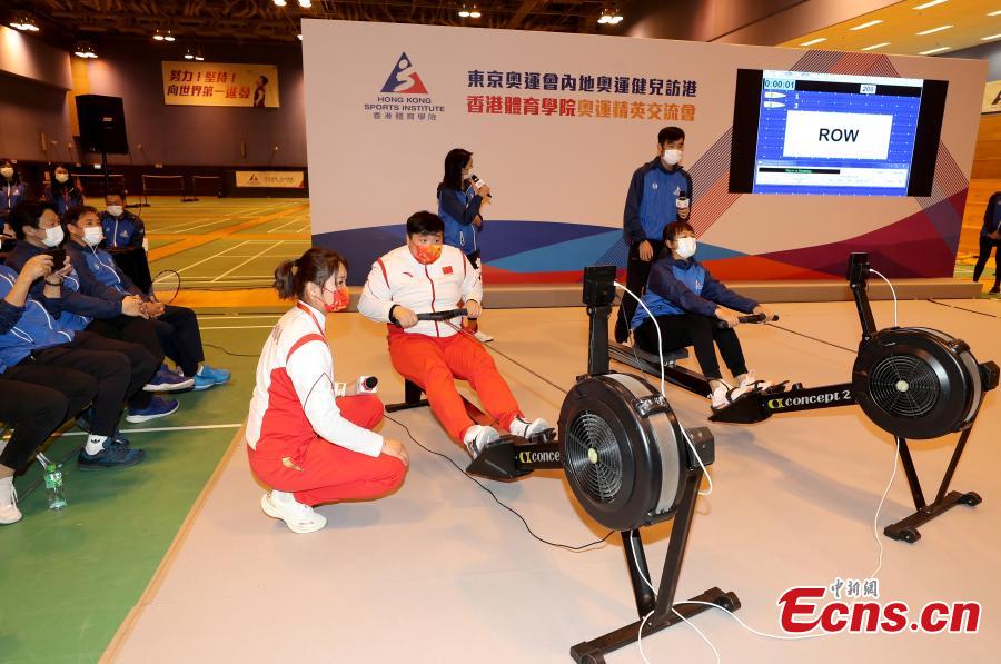 Tokyo Olympic women's quadruple sculls champion Zhang Ling (1st L) and shot put champion Gong Lijiao (2nd L) interact with Hong Kong athletes at the Hong Kong Sports Institute, Hong Kong, December 5, 2021. (Photo: China News Service/Zhang Yu)