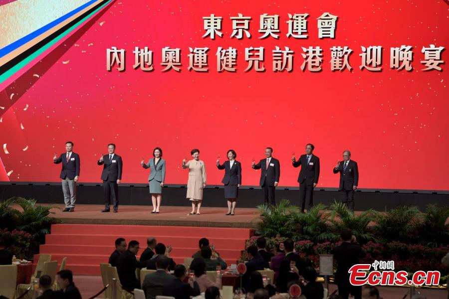Hong Kong Chief Executive Carrie Lam Cheng Yuet-ngor (4th L) and Lu Xinning (3rd L), deputy head of the Liaison Office of the Central People's Government in the HKSAR, attend the welcome dinner held for Mainland Olympic athletes at the Hong Kong Convention and Exhibition Center in Hong Kong, Dec. 3, 2021. (Photo: China News Service/Li Zhihua)