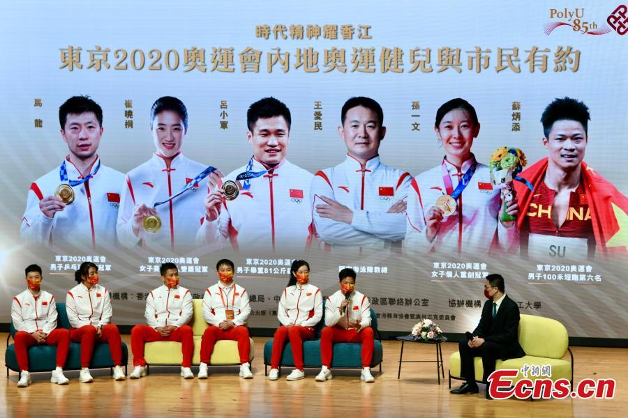 Some of the Chinese mainland athletes, including "Asia's fastest sprinter" Su Bingtian, and Ma Long, Lu Xiaojun, Cui Xiaotong and Sun Yiwen, who won gold medals in table tennis, weightlifting, rowing and fencing respectively at the Tokyo Olympics, visit the Hong Kong Polytechnic University together with national swimming coach Wang Aimin, sharing their experiences and insights in Hong Kong, December 5, 2021. (Photo: China News Service/Li Zhihua)