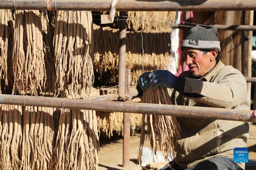 Villagers sort and dry dangshen root from the plant codonopsis pilosula, often used in traditional Chinese medicine (TCM), in Zhangxian County of Dingxi City, northwest China's Gansu Province, on Dec. 5, 2021. In recent years, Zhangxian County has adjusted its farming structure and focused on developing raw materials for the medicine industry. (Xinhua/Wang Kexian)