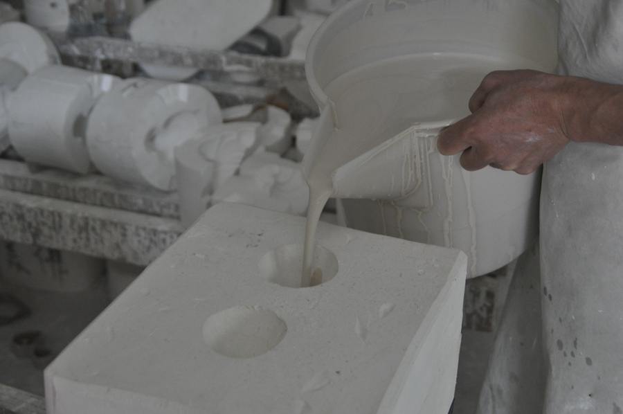 Liquid clay is poured into a plaster mold. (Photo courtesy of the interviewee)