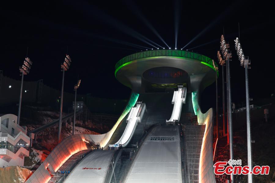 The landscape lights in the National Ski Jumping Center are lit up in Chongli District of Zhangjiakou City, north China's Hebei Province, Dec. 4, 2021. (Photo: China News Service/Fu Tian)