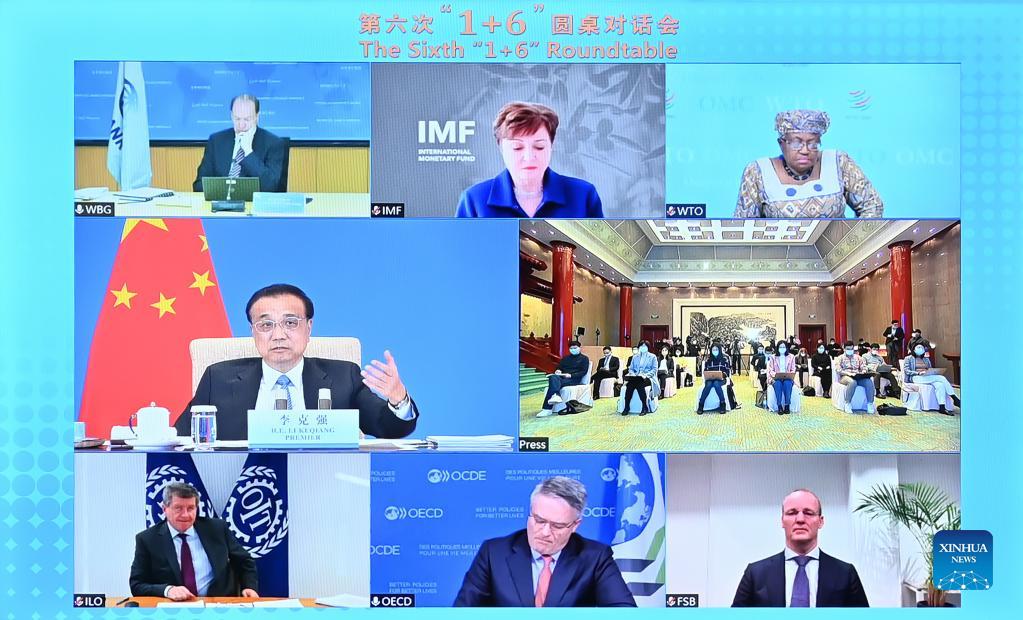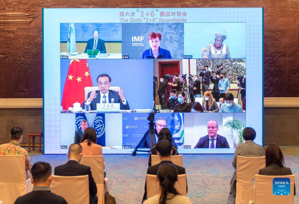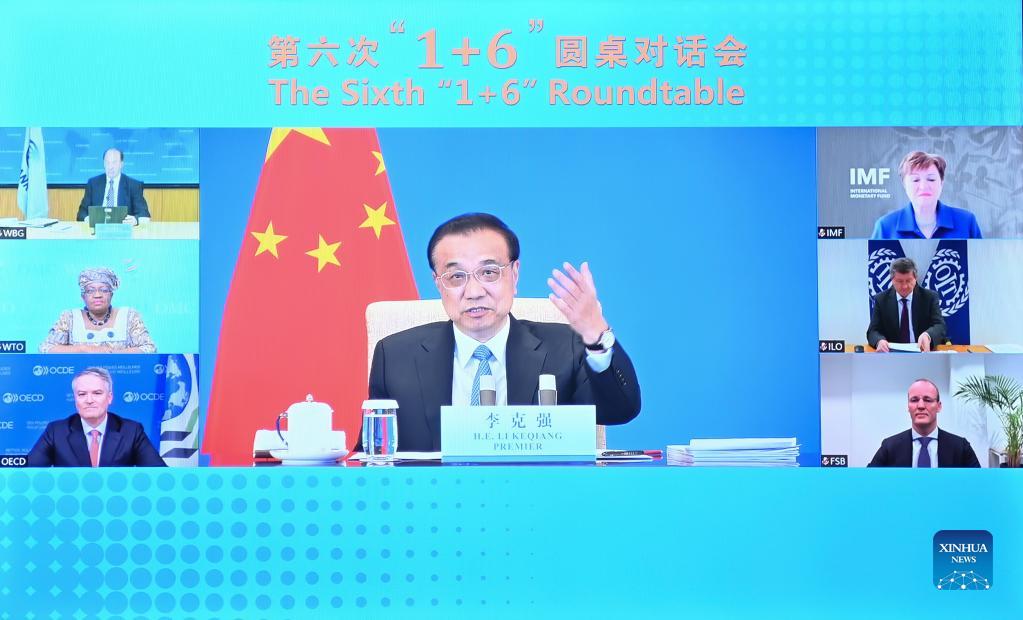 "Cooperation among all should be enhanced to promote the steady recovery of the world economy and early victory over COVID-19," Li said while holding the sixth "1+6" Roundtable in Beijing via video link with heads of major international economic organizations.