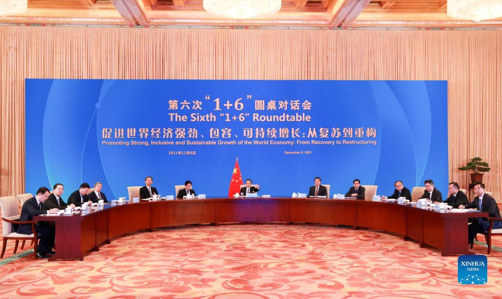 Chinese Premier Li Keqiang holds the sixth "1+6" Roundtable in Beijing via video link with heads of major international economic organizations, Dec. 6, 2021. President of the World Bank Group David Malpass, Managing Director of the International Monetary Fund Kristalina Georgieva, Director-General of the World Trade Organization Ngozi Okonjo-Iweala, Director-General of the International Labor Organization Guy Ryder, Secretary-General of the Organization for Economic Cooperation and Development Mathias Cormann, and Chairman of the Financial Stability Board Klaas Knot attended the meeting. (Xinhua/Li Xiang)