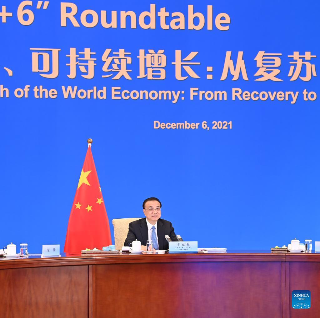 Chinese Premier Li Keqiang attends a press conference in Beijing via video link with heads of major international economic organizations after virtually holding the sixth "1+6" Roundtable, Dec. 6, 2021. President of the World Bank Group David Malpass, Managing Director of the International Monetary Fund Kristalina Georgieva, Director-General of the World Trade Organization Ngozi Okonjo-Iweala, Director-General of the International Labor Organization Guy Ryder, Secretary-General of the Organization for Economic Cooperation and Development Mathias Cormann, and Chairman of the Financial Stability Board Klaas Knot attended the meeting. (Xinhua/Li Xiang)