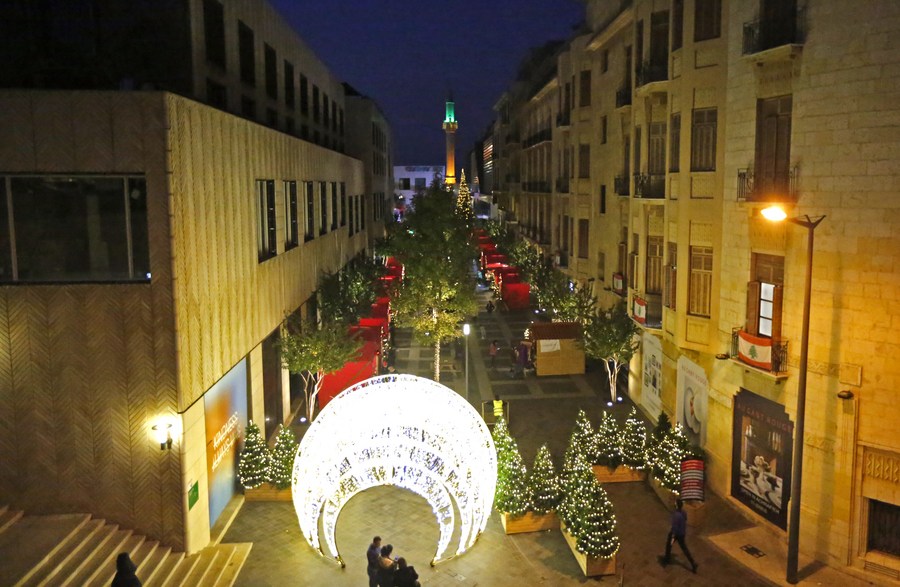 Christmas decorations are seen in downtown Beirut, Lebanon, on Dec. 6, 2021. (Xinhua/Bilal Jawich)