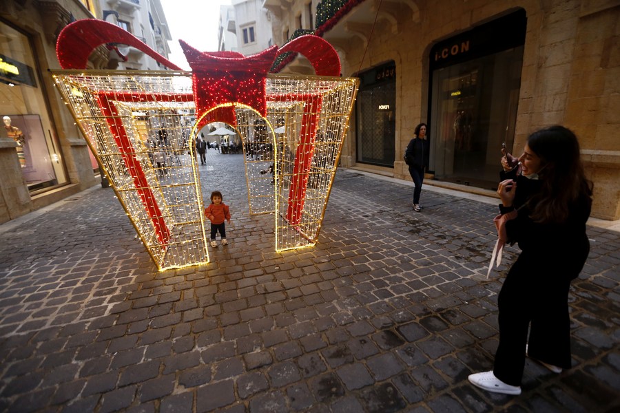 child poses for photos inside a Christmas installation in downtown Beirut, Lebanon, on Dec. 6, 2021. (Xinhua/Bilal Jawich)