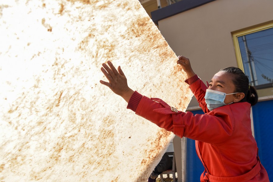 A craftswoman checks a piece of mulberry-bark paper in Moyu County of Hotan, northwest China's Xinjiang Uygur Autonomous Region, Nov. 1, 2020. Mulberry-bark paper making, a craft of over 1,300 years of history, is listed as a Chinese national intangible cultural heritage. The paper boasts a quality of being antiseptic, absorbent and tensile. (Xinhua/Ding Lei)