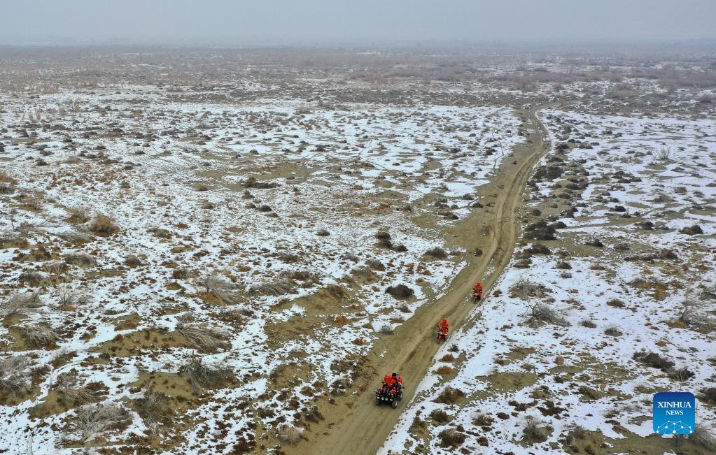 Staff member from a forest management and protection station, along with an emergency handling team of the Ganjia Lake forest region, check the growth of white saxaul trees in Wusu City of northwest China's Xinjiang Uygur Autonomous Region, Dec. 4, 2021. As winter approaches, authorities have been paying more attention to forest fire prevention in the Ganjia Lake forest region in the west of Junggar Basin. Forest rangers have also stepped up their patrolling efforts. In the Ganjia Lake forest region, there are 18 forest management and protection stations that are responsible for forest fireproofing, management of forest resources and grassland and wild animal protection. With improved transportation, staff members can now monitor a considerably larger area of woodland. The Ganjia Lake forest region, with an area of roughly 3,920,000 mu (about 2613.3 square kilometers) and over 110 plant species, serves as an important ecological protective screen for preventing land desertification. (Xinhua/Bai Zhiqiang)