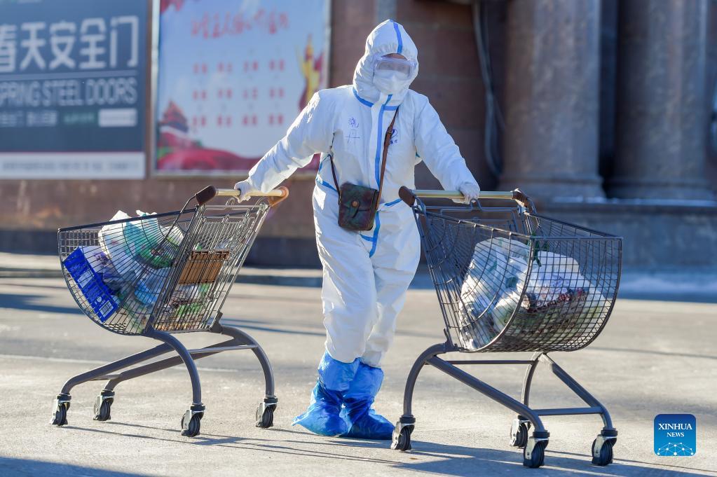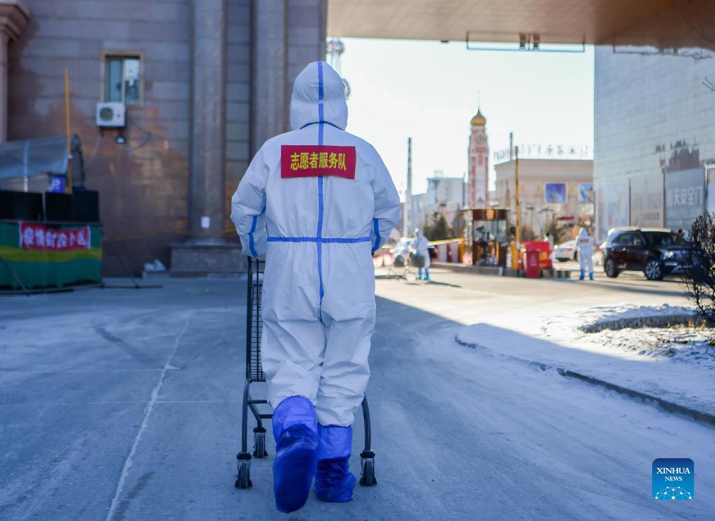 A volunteer sends daily necessities to residents in the border city of Manzhouli in north China's Inner Mongolia Autonomous Region, Dec. 5, 2021. Manzhouli reported five confirmed locally transmitted COVID-19 cases from 12 a.m. to 2 p.m. on Sunday, local authorities said. So far, the city has reported 332 locally transmitted confirmed COVID-19 cases in the latest outbreak. All cases are receiving treatment at a designated local hospital, according to a press briefing. (Xinhua/Li Zhipeng)
