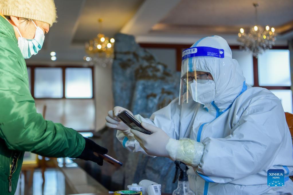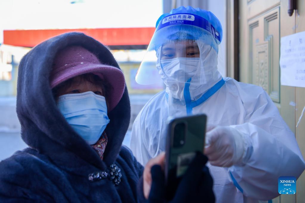 A volunteer helps a resident to show her health code on a mobile phone in the border city of Manzhouli in north China's Inner Mongolia Autonomous Region, Dec. 6, 2021. Manzhouli reported five confirmed locally transmitted COVID-19 cases from 12 a.m. to 2 p.m. on Sunday, local authorities said. So far, the city has reported 332 locally transmitted confirmed COVID-19 cases in the latest outbreak. All cases are receiving treatment at a designated local hospital, according to a press briefing. (Xinhua/Wei Jingyu)